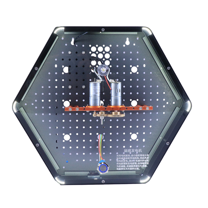 Интерактивный модуль для оформления зон рекреации, кабинетов, IT-полигона, библиотеки, медиа зоны. Модуль позволяет изучить преобразование электрической и механической энергии, взаимодействие между магнитным полем и током и генерирование индуцированной электродвижущей силы, а также принцип работы зубчатой передачи. Модуль выполнен в форме шестиугольной призмы с интерактивным наполнением.
