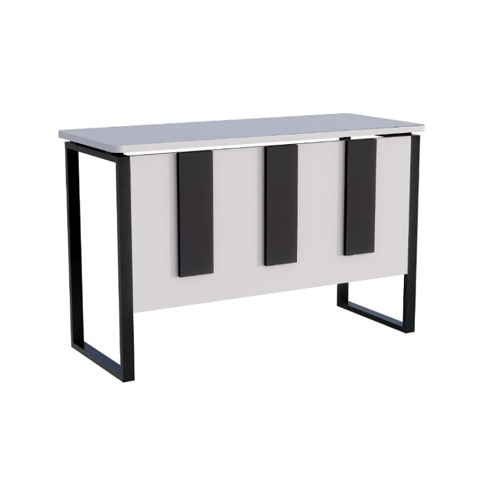 Парта на 2-х боковых О-образных опорах, соединенных между собой траверсами, крышкой и царгой, создающей эффект легкости и динамичности конструкции.