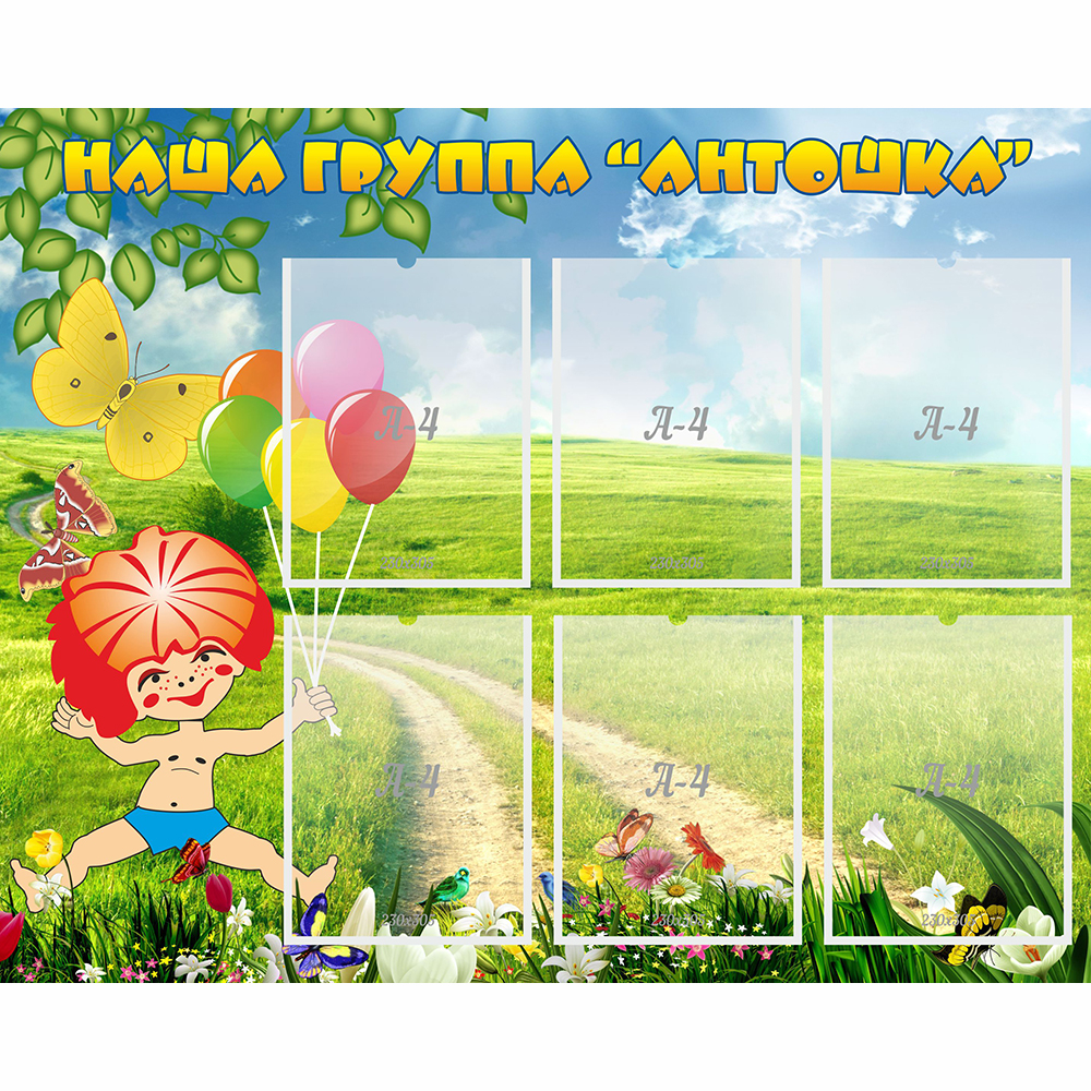 Веселый Антошка будет встречать детей с улыбкой на лице. Рыжий мальчик-непоседа держит в руках разноцветные воздушные шары, а возле него летает яркая большая бабочка.